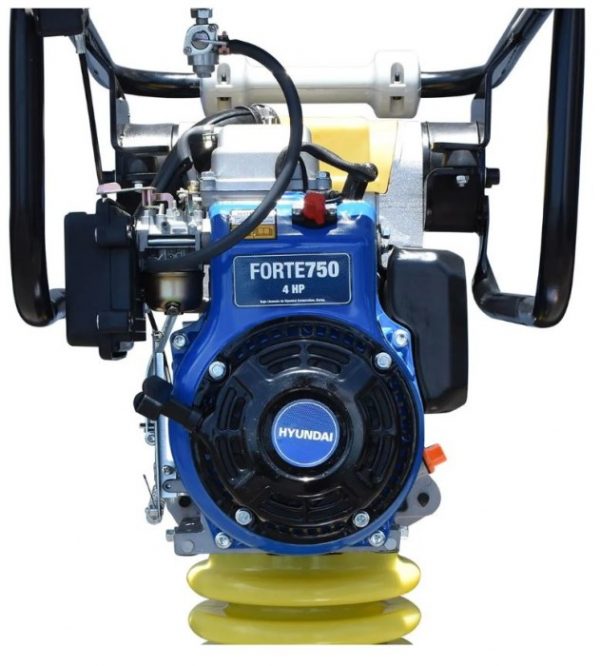 La Bailarina Apisonadora Hyundai FORTE750 es una herramienta robusta con motor Honda de 4 tiempos y 4 hp, diseñada para la compactación eficiente de suelos en obras, caminos y bacheos. Su diseño incluye un doble filtro de aire para un rendimiento óptimo y una larga vida útil, siendo ideal para uso profesional en construcción
