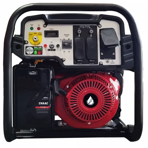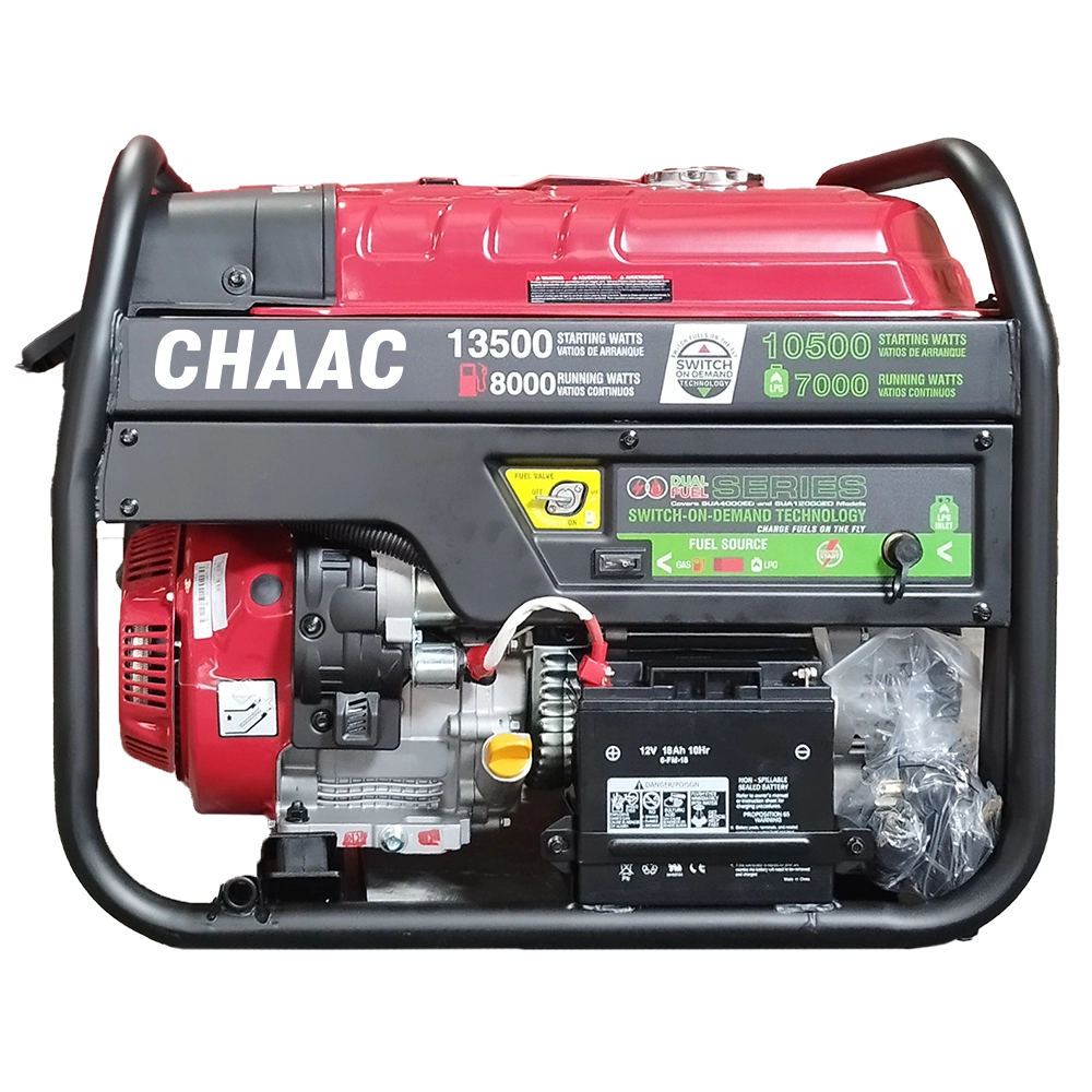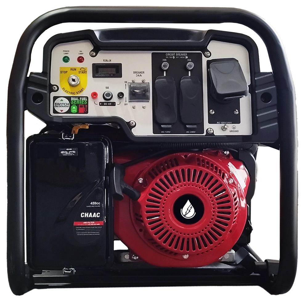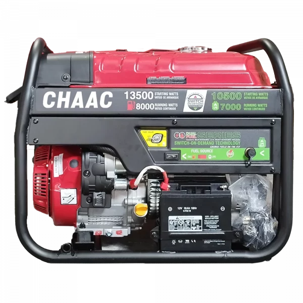 Generador de combustible dual gasolina y Gas LP, tablero para clavija americana portátil, cuenta con ruedas y agarradera para facillitar su transporte, tablero para clavija americana, incluye clavijas y manguera para conexión a gas.